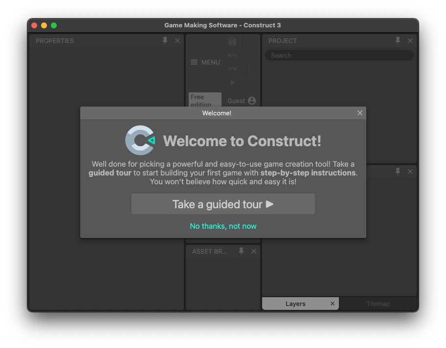 So I wrote a little project that opens the Construct 3 website in a window and only allows you to make games, nothing else. I even disallowed browsing the community games list (which is part of the Construct 3 web app) so that the kid wouldn’t have to deal with the temptation of just playing others' little games.